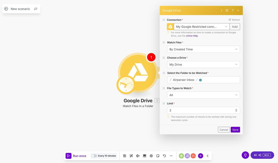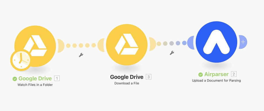 Automatically parse documents (PDFs, Word docs, images, email files, etc.) placed in a Google Drive folder. Extract structured data using Airparser without manual uploading — fully automated via Make.