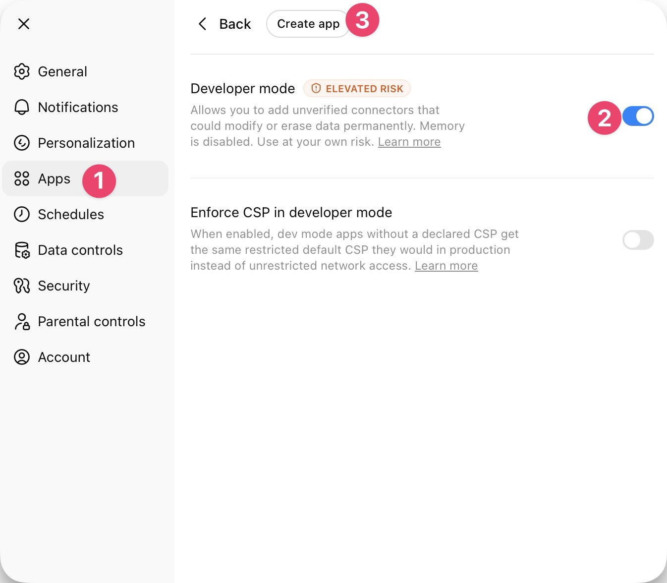 Note: ChatGPT labels developer mode as elevated risk because custom MCP servers are not reviewed by OpenAI.