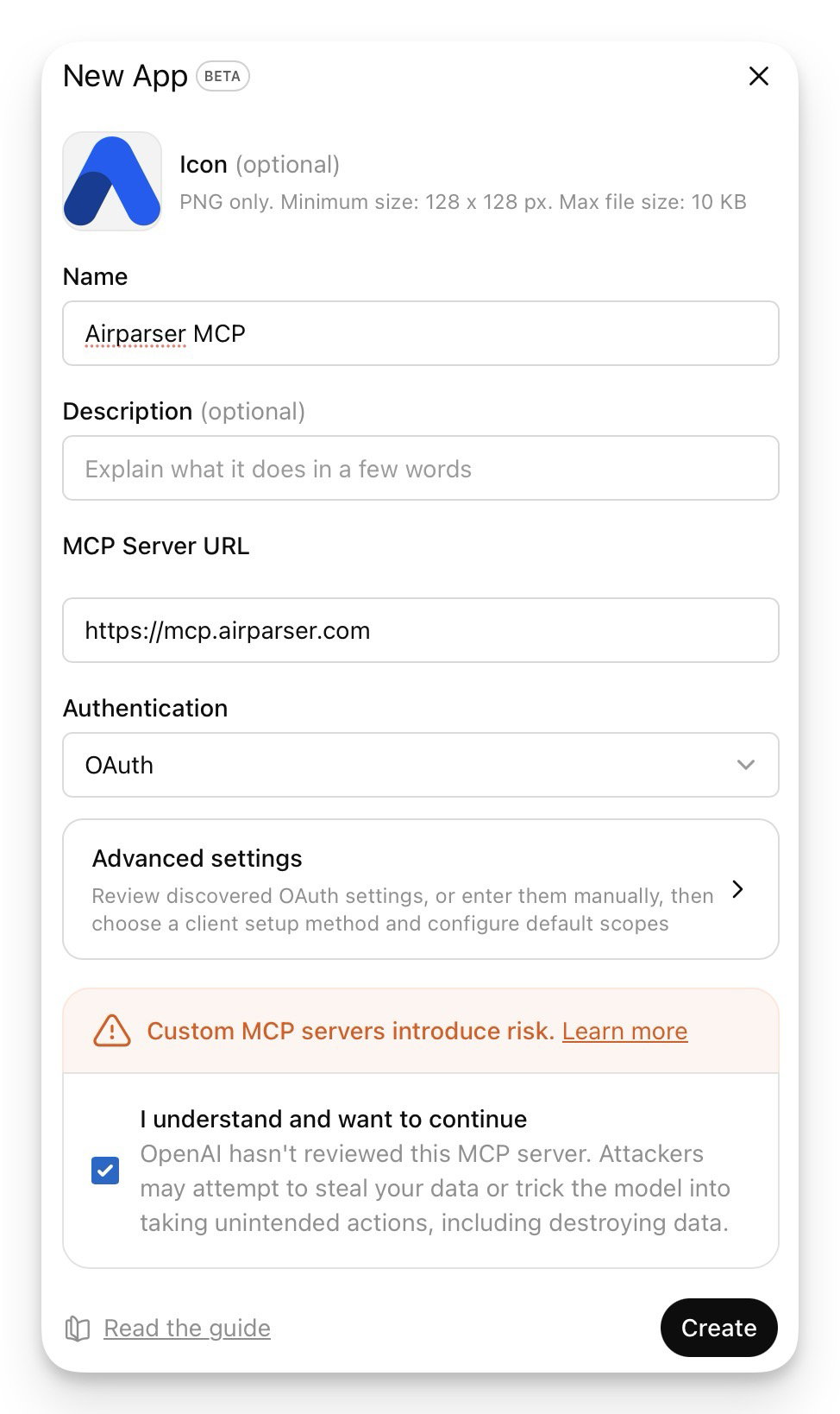 You can connect Airparser MCP to ChatGPT so ChatGPT can work directly with your Airparser account.