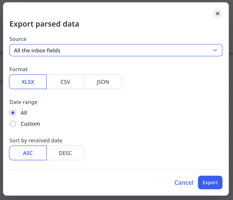 π Download to File The extracted data can be downloaded from your Airparser inbox in formats: Excel, CSV, or JSON. Simply navigate to the "Parsed Data" page and click on "Export":