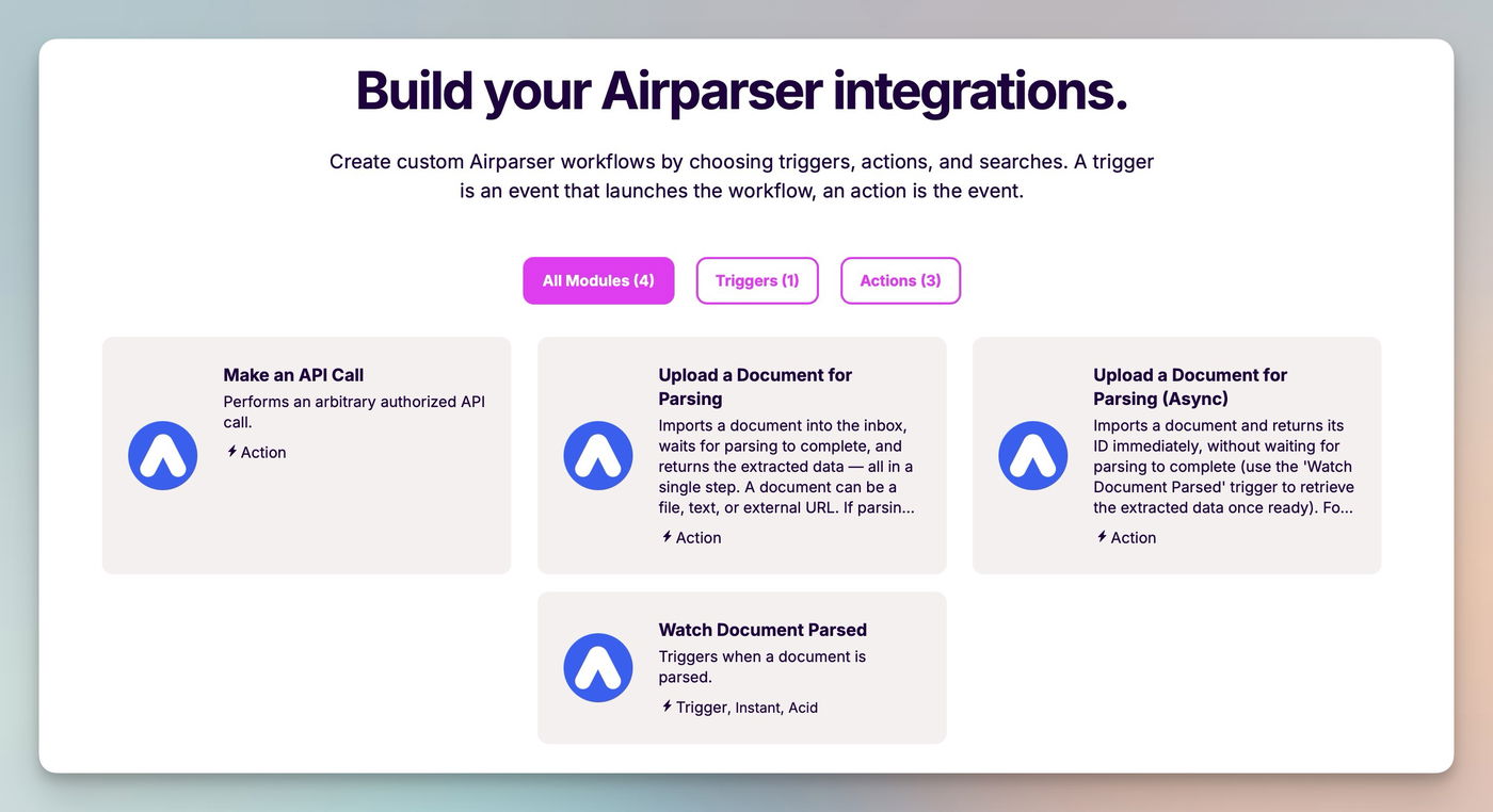 Airparser's Make integration supports 1 trigger and 3 actions.