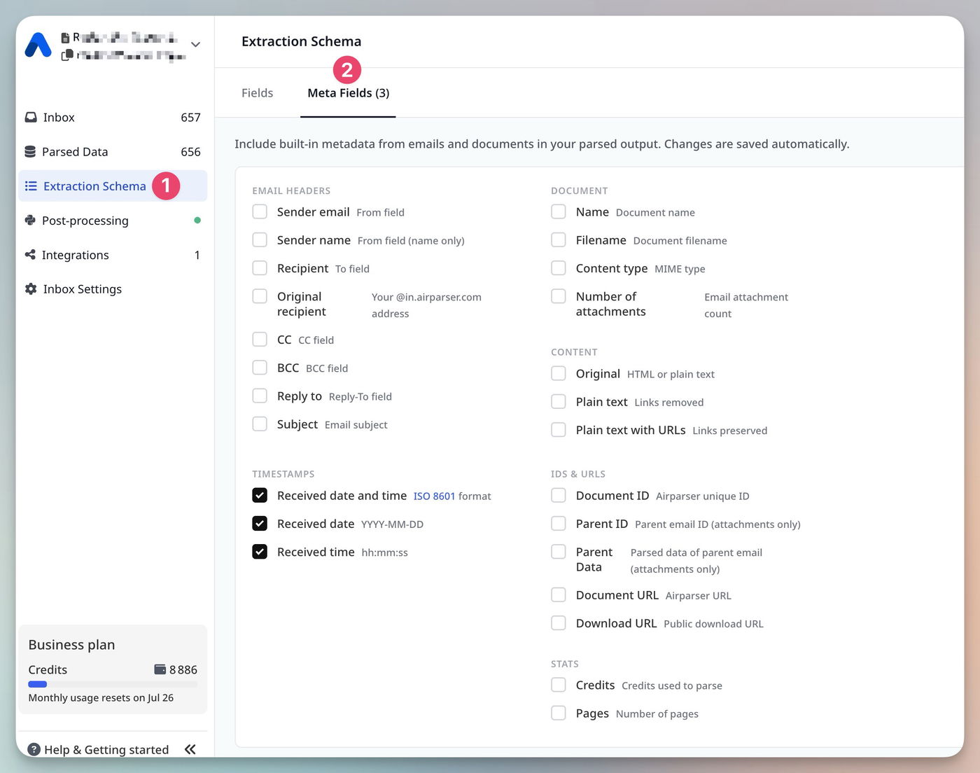 Regular extraction schema fields extract structured data from the document content (e.g. invoice number, total amount, line items). Meta fields are defined once at the inbox level and are automatically populated for every document that arrives β no AI extraction involved.