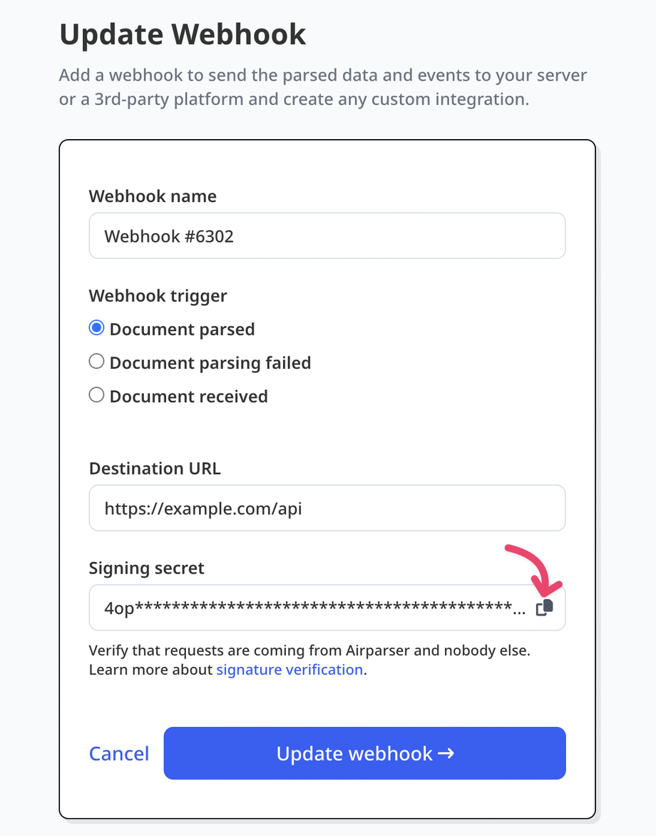 When you create a webhook, Airparser generates a unique Signing Secret. This secret is employed to sign each webhook payload, and the resulting signature is sent in the request header as airparser-signature. By verifying this signature before processing webhooks, you can ensure that the incoming request is both genuine and originates from Airparser.