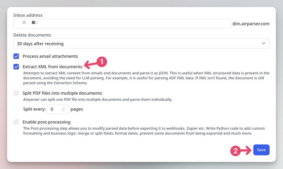 - Airparser scans your emails and documents for embedded XML.